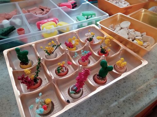 本日のプログラムは、小さな箱の中に可愛い庭を作ってみました。 木、花、畑、うさぎ、ねこ、亀、電車、車、戦車、砂、芝、木片、タイルなどのほか、粘土で好きな物を作ったりして色々な材料を使い、自由に箱の上に置いていきます。 みんな集中して作ってい…