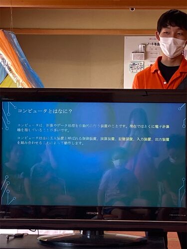 本日、午前中のプログラムは みんなの好きなパソコンですが…今日はゲームとかではなく…座学でした コンピュータとは何か…とか子どもたちに質問などしながら、説明していきました。 ちゃんと座って聞いてます❗️ おやつに例えた質問には、速攻で答えてました A…
