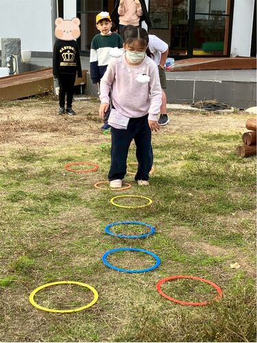 本日のプログラムは運動❗️お天気もいいのでお庭に出て、けんけんパーをしました。私の子どもの頃は、みんなでよく遊んでいたのですが…今はどうなんでしょうね 運動苦手…と言う子どもも楽しく遊んでくれました❣️✌️ 室内に戻り、今度は最近流行っているらしい…